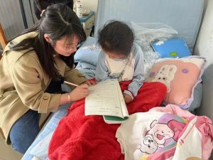 华中农业大学“本禹研究生支教团”成员陪伴孩子,在医院辅导孩子功课