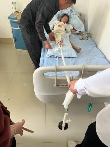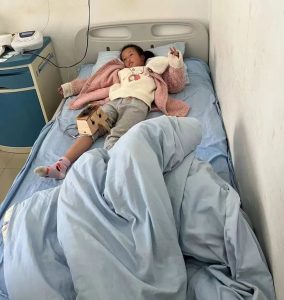 孩子住院治疗场景,据了解孩子目前的情况还需要继续拉伸腿部,预计五一后再做手术。