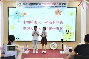 8月9日,2025岭南新世界“欢迎小候鸟”夏令营结营仪式在永平街党群服务中心圆满落幕。本次活动主题是“幸福岭南人 和谐永平街 唱好大湾区 迎接十五运”,除了粤语童谣汇演,仪式上还展示了20名学员以“我与全运会”、“粤语三字经”、“白云汽车大道”等主题创作的绘画、手工作品。岭南新世界片区联合党委书记曹灵辉、永平街双百社工站副站长莫丽兴、新世界中国华南区域品牌与传播部副总监雷镇海、伟博基金会秘书长彭蔚等嘉宾出席了本次活动,共同见证了小候鸟们在这个夏天的成长与收获。
